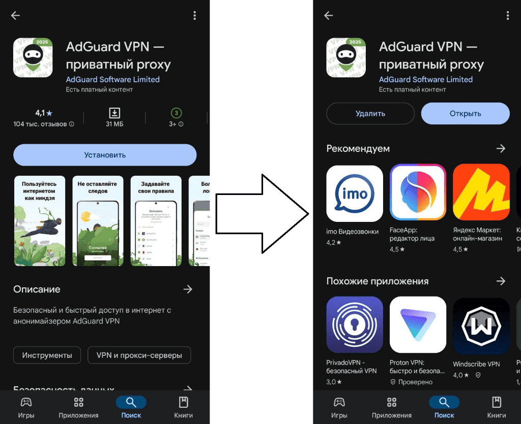 Для установки через Google Play откройте магазин приложений, введите в поиске «AdGuard VPN» и перейдите на страницу приложения. После этого нажмите «Установить», дождитесь окончания установки (приложение весит 31 МБ) и нажмите «Открыть», чтобы запустить AdGuard VPN.