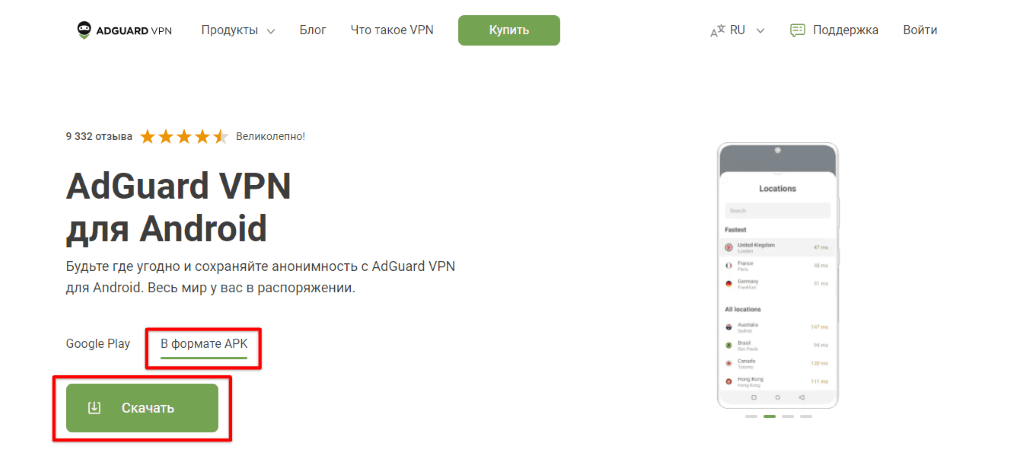 Для установки через APK-файл откройте сайт AdGuard VPN (конкретно – страницу «Для Android»), выберите вкладку «В формате APK» и нажмите «Скачать».