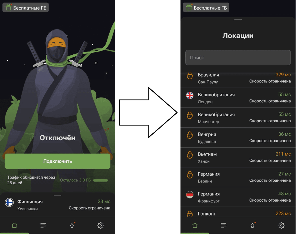 На главном экране AdGuard VPN отображается статус VPN-соединения («Отключен» или «Подключен»). Чтобы подключить, нажмите одноименную кнопку. Приложение автоматически подключится к серверу. Чтобы вручную изменить его, откройте шторку ниже (где название страны) и выберите нужную локацию.