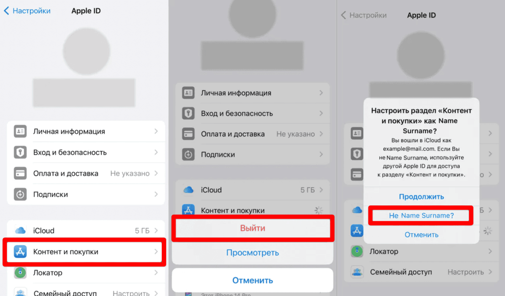 Теперь откройте настройки на iPhone и перейдите в раздел «Контент и покупки». Здесь выйдите из App Store (авторизация в Apple ID останется). Затем снова зайдите в «Контент и покупки» и нажмите «Не [ваше имя]?», куда нужно ввести данные нового аккаунта.