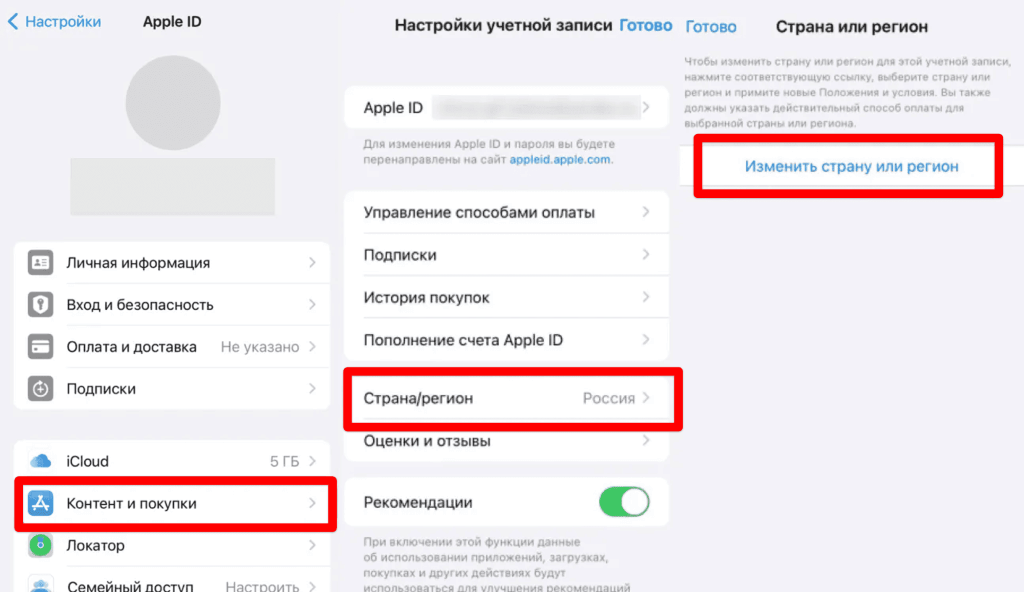 - Откройте «Контент и загрузки», а затем – «Страна и регион»;