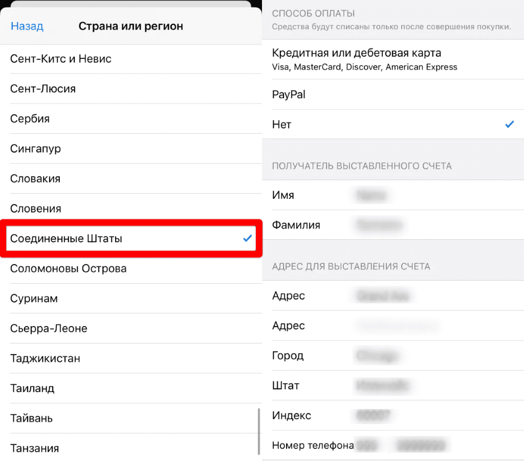 Теперь выберите страну – например, США. После этого уточните способ оплаты (если подходящего нет – нажмите «Нет») и адрес для выставления счета (разрешается использовать любой, но индекс должен соответствовать выбранной стране).