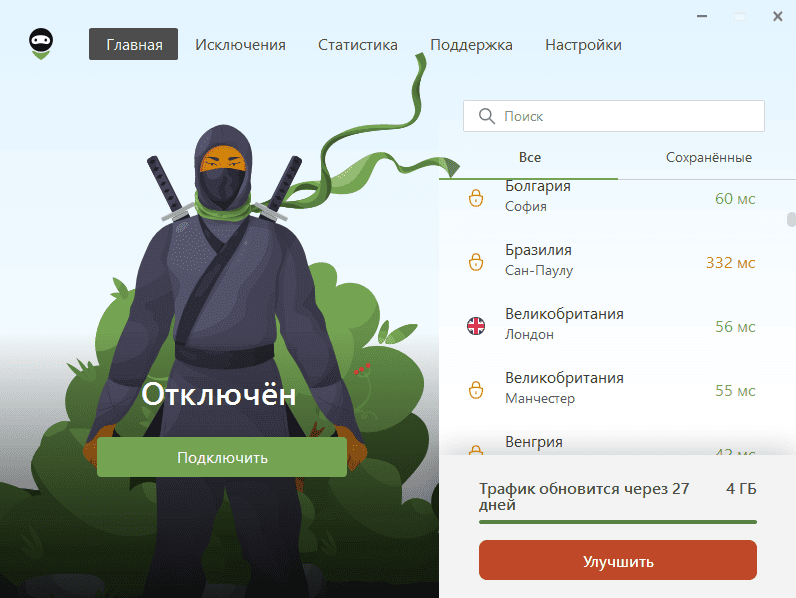 В бесплатной версии программы отображается остаток трафика. Если нажать кнопку «Улучшить» – откроется страница с платной подпиской.