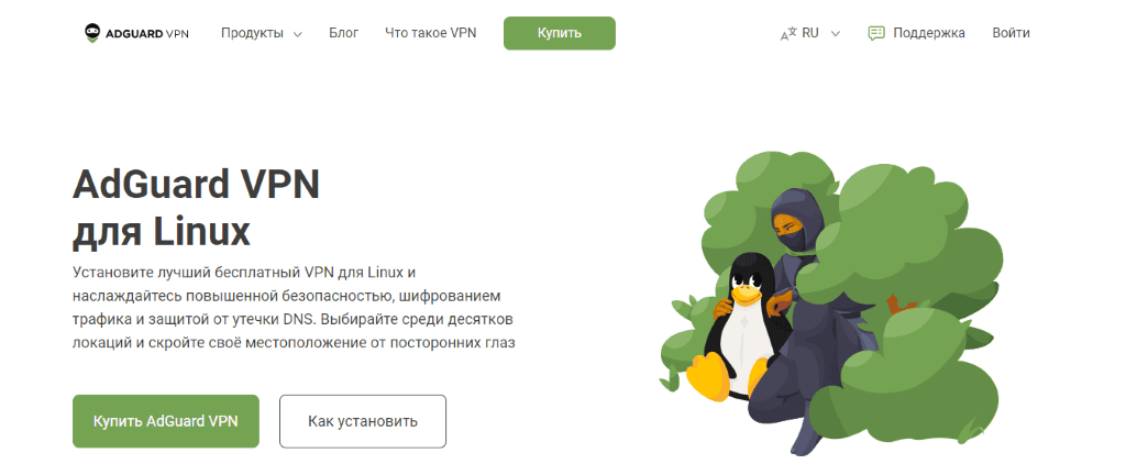 Клиент AdGuard VPN доступен для популярных Linux-дистрибутивов (Debian, Ubuntu, Elementary OS, Linux Mint или RPM). Для установки откройте сайт VPN-сервиса, выберите вкладку «Продукты» и нажмите «Для Linux»