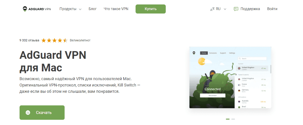 Клиент для MacOS предлагается скачать с сайта AdGuard VPN. Для этого выберите вкладку «Продукты» и нажмите «Для MacOS».