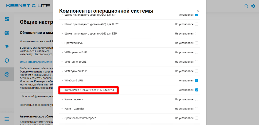 В списке доступных компонентов найдите IPsec/IKEv2. Если они не установлены – установите и дождитесь обновления интернет-центра.