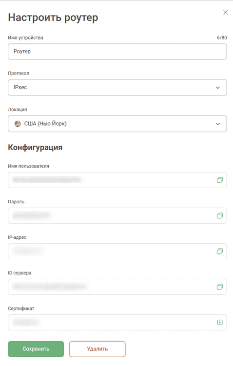 Теперь откройте аккаунт AdGuard VPN, добавьте в список устройств роутер и настройте. Введите имя роутера, выберите протокол (IPsec), локацию. Данные конфигурации роутера скопируйте.