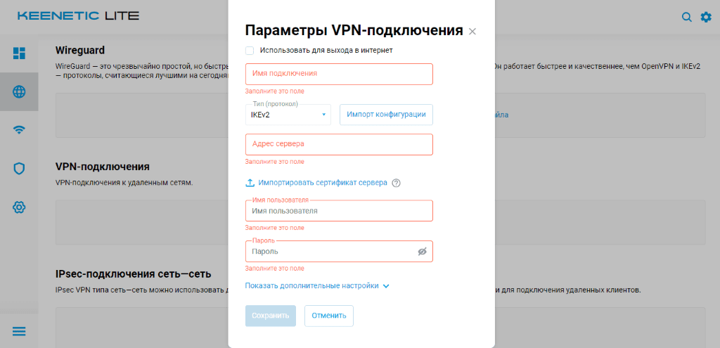 Теперь вернитесь в панель управления роутером, выберите в меню «Интернет» и нажмите «Другие подключения». На открывшейся странице выберите «VPN-подключения» и нажмите «Добавить подключение». Здесь выберите протокол IKEv2 и вставьте данные конфигурации из личного кабинета AdGuard VPN в соответствующие поля.